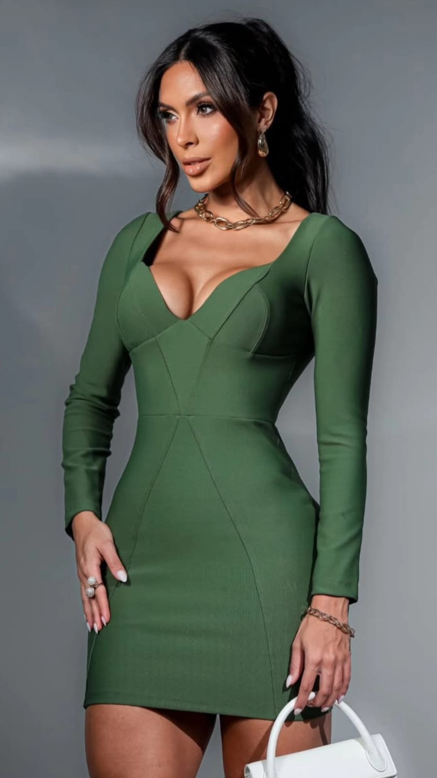 Vestido curto feminino , com modelagem ajustada ao corpo que valoriza a silhueta. A peça possui mangas longas e um decote profundo em formato coração, com estrutura marcada no busto, proporcionando sustentação e efeito “push-up”. As costuras frontais estratégicas ajudam a alongar visualmente a silhueta e conferem um caimento elegante. O vestido é feito de um tecido encorpado e boa elasticidade.